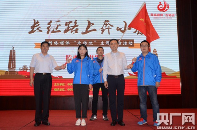 中共陜西省委宣傳部副部長、省委網信辦主任孫琳,中央網信辦傳播局副局長陳云峰向采訪團代表中國經濟網于躍授旗,向央廣網王啟慧、西部網趙昊授接力棒