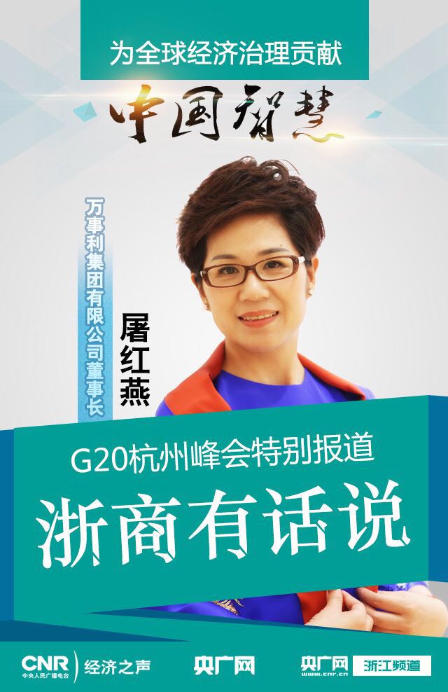 屠紅燕:B20峰會有6個工作組,其中有貿易投資組,也有基礎設施組等。我在貿易投資組可能是因為對這塊兒比較熟悉一點。貿易投資組為這次B20峰會提了3個提案,交給組委會。第一,希望G20各國加強多邊貿易體系,促進貿易增長,鼓勵貿易增長,盡可能減少貿易保護措施;第二,2016年希望加快實施此前提出的G20各國加強貿易TFA,也就是貿易便利化協定,萬事利也做外貿,在這個過程中,出口到國外的貨物,要根據當地的法律清關,各國都會制定一些相應對自己國家有利的保護措施,可能有些措施就會妨礙國際貿易的推進。所以我們這次也提出這個議題,希望能夠提高效率;第三,希望G20成員國提供更加有效、有利于國際貿易的政策,特別是在跨境投資方面,萬事利也有在國外收購企業,這個過程當中,國與國之間也會有一些政策性的壁壘,會影響收購,時間也會拖得很長。