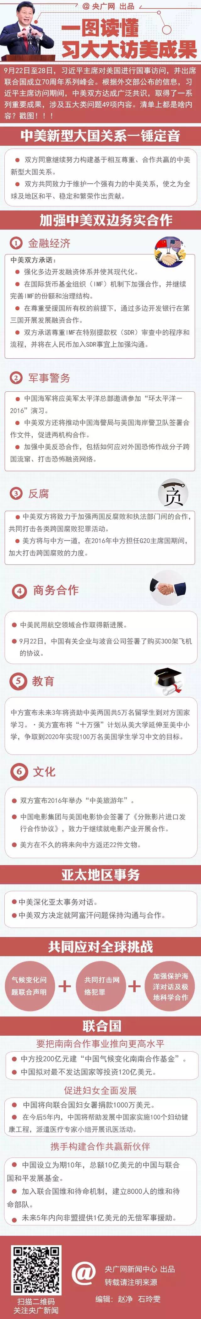 9月22日至28日,習近平主席對美國進行國事訪問,并出席聯合國成立70周年系列峰會。根據外交部公布的信息,訪問期間,中美雙方達成廣泛共識,取得了一系列重要成果,涉及五大類問題49項內容。清單上都是啥內容?戳圖!!!