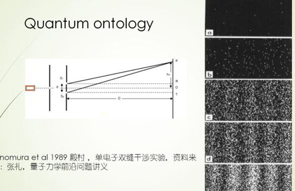 物理學(xué)家就為這個(gè)爭論了幾十年,細(xì)節(jié)我不多說,但總而言之現(xiàn)在基本上大家公認(rèn)的結(jié)論是肯定這個(gè)電子是同時(shí)走這兩個(gè)縫,否則的話無論如何最后大數(shù)據(jù)不會(huì)顯示那樣的結(jié)果。這就給我們?nèi)祟惖氖澜缬^真的是極大地顛覆,因?yàn)閭鹘y(tǒng)地總是認(rèn)為任何的物質(zhì)定義地要存在哪里,就肯定存在哪里的,它要走的應(yīng)該是軌道,這是牛頓力學(xué)堅(jiān)持的。
