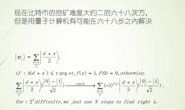 但是用量子計(jì)算機(jī)跟剛才說的一樣,那2的68次方理論上可能本來是一個(gè)天文數(shù)字可能下降到不到100次,它能給你算出來。因?yàn)樗强梢酝瑫r(shí)輸入的,管你多少個(gè)。我一半看找到?jīng)]有,如果找到了,那一半我不用算了,然后我再把它分兩半,總而言之,我靠很有限的步驟,不超過100步,就能把你原來算2的68次方這么多次壓縮到這種程度。所以未來量子計(jì)算機(jī)真要造出來的話,那對比特幣整個(gè)挖礦的產(chǎn)業(yè)會(huì)有非常大的影響。